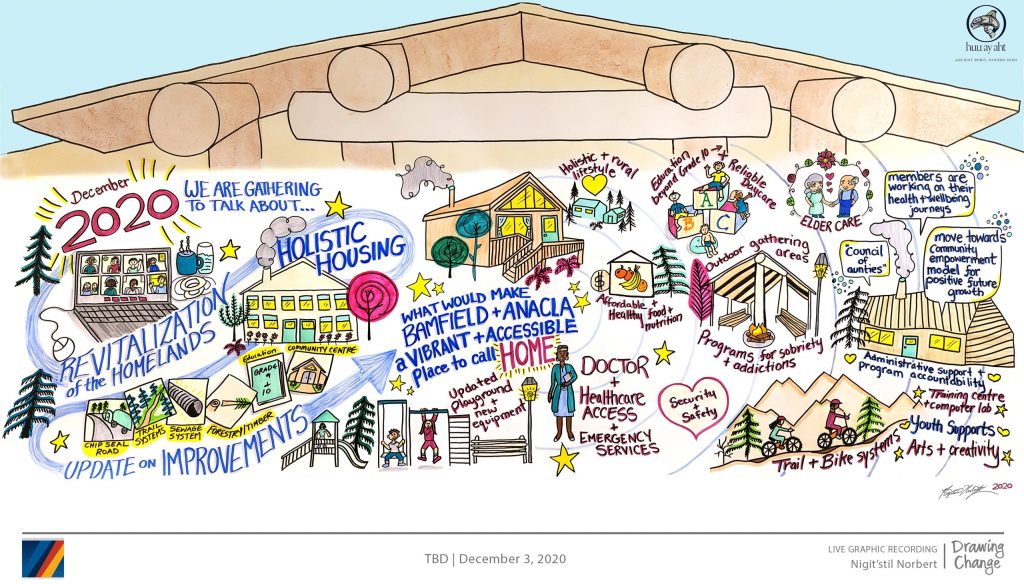 Ecotrust Canada’s Indigenous Home-Lands (IHL) team is thrilled to announce the successful completion of our first Housing Solutions Lab Workshop with partner Huu-ay-aht First Nations (HFN). Facilitated by Jacqueline Jennings of RADIUS SFU, with graphic facilitation support courtesy of Nigitst’il Norbert of Drawing Change, this virtual workshop brought Huu-ay-aht citizens, staff and government officials together to share community development updates, listen to citizen experiences and perspectives, and discuss housing challenges and potential solutions.